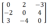 Es una matriz cuadrada cuyos elementos simétricos respecto de la diagonal principal son iguales en valor absoluto y de signo contrario. Además, los elementos de la diagonal son cero.